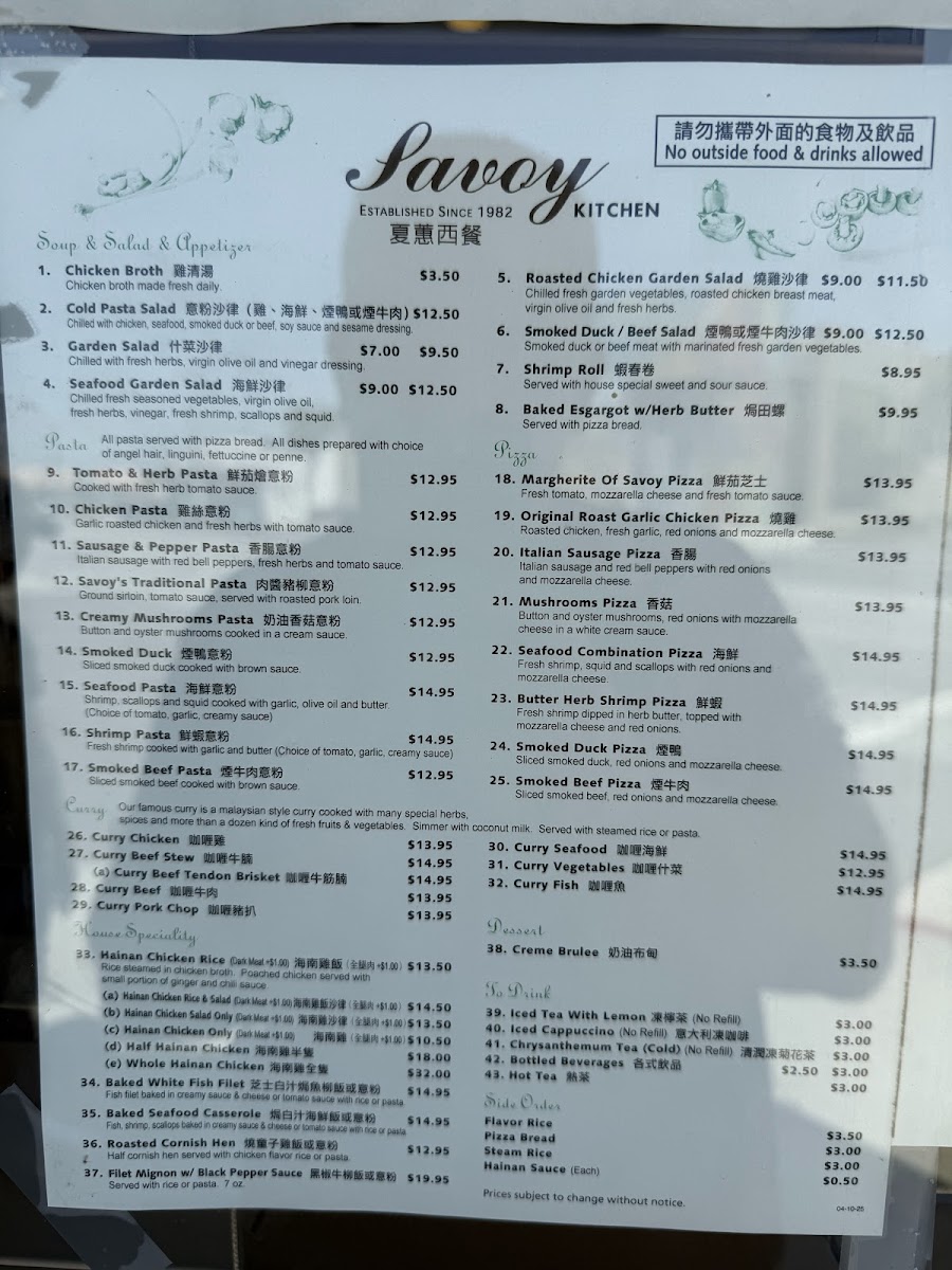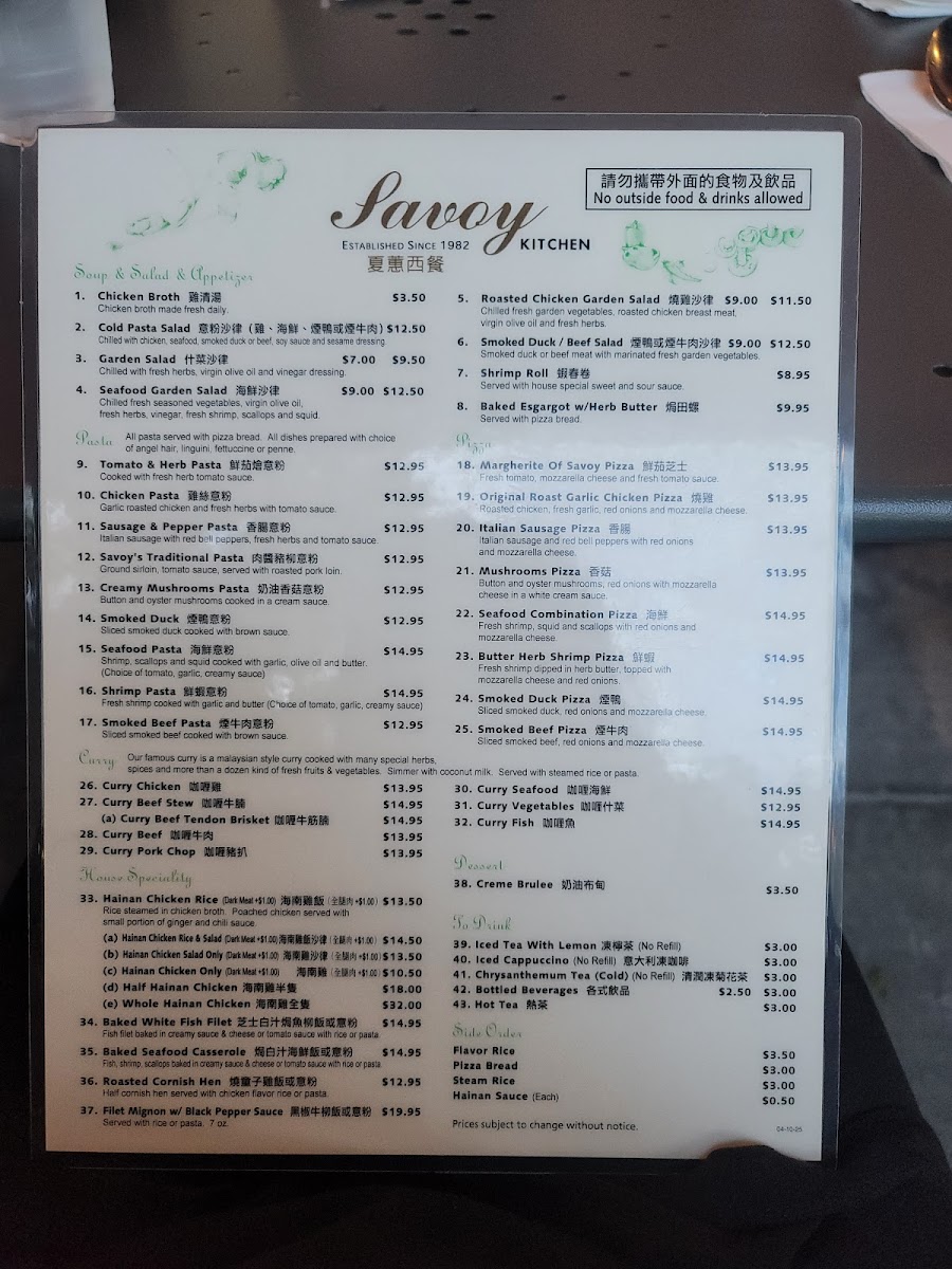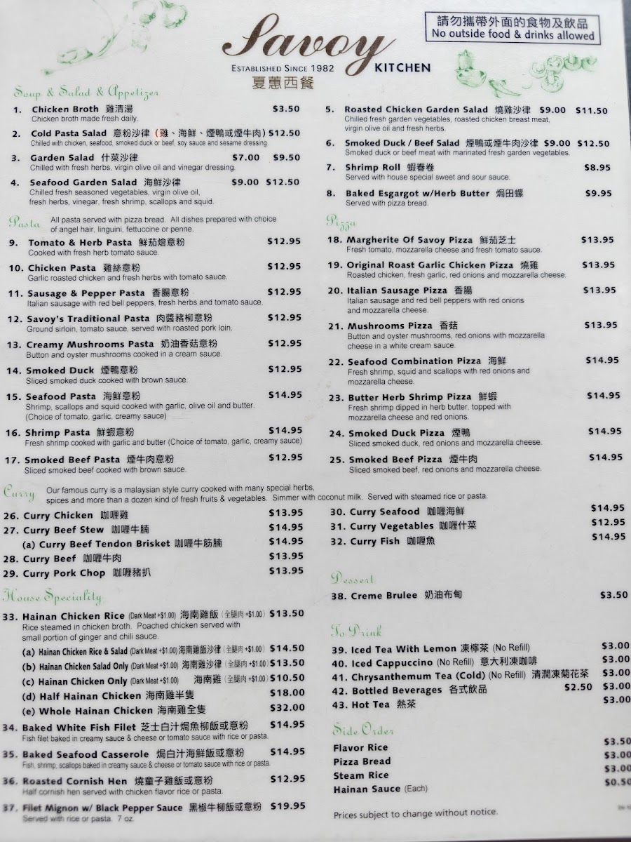 The menu at Savoy Kitchen offers a diverse selection that reflects its blend of Chinese, Southeast Asian, Vietnamese, and fusion cuisine. Visitors can expect a variety of dishes featuring signature items such as Hainanese chicken rice available with different meat options, seafood-based curries, and a range of other rice and noodle dishes. The menu also includes lighter fare like salads and unique fusion items including pizzas and escargot.