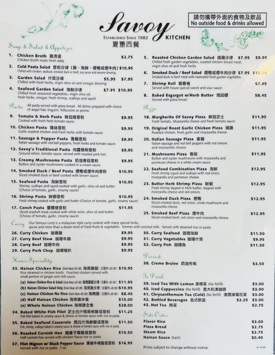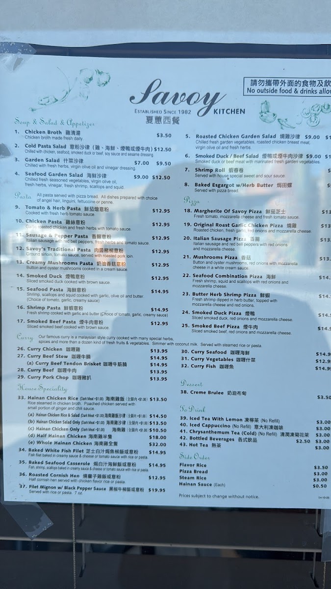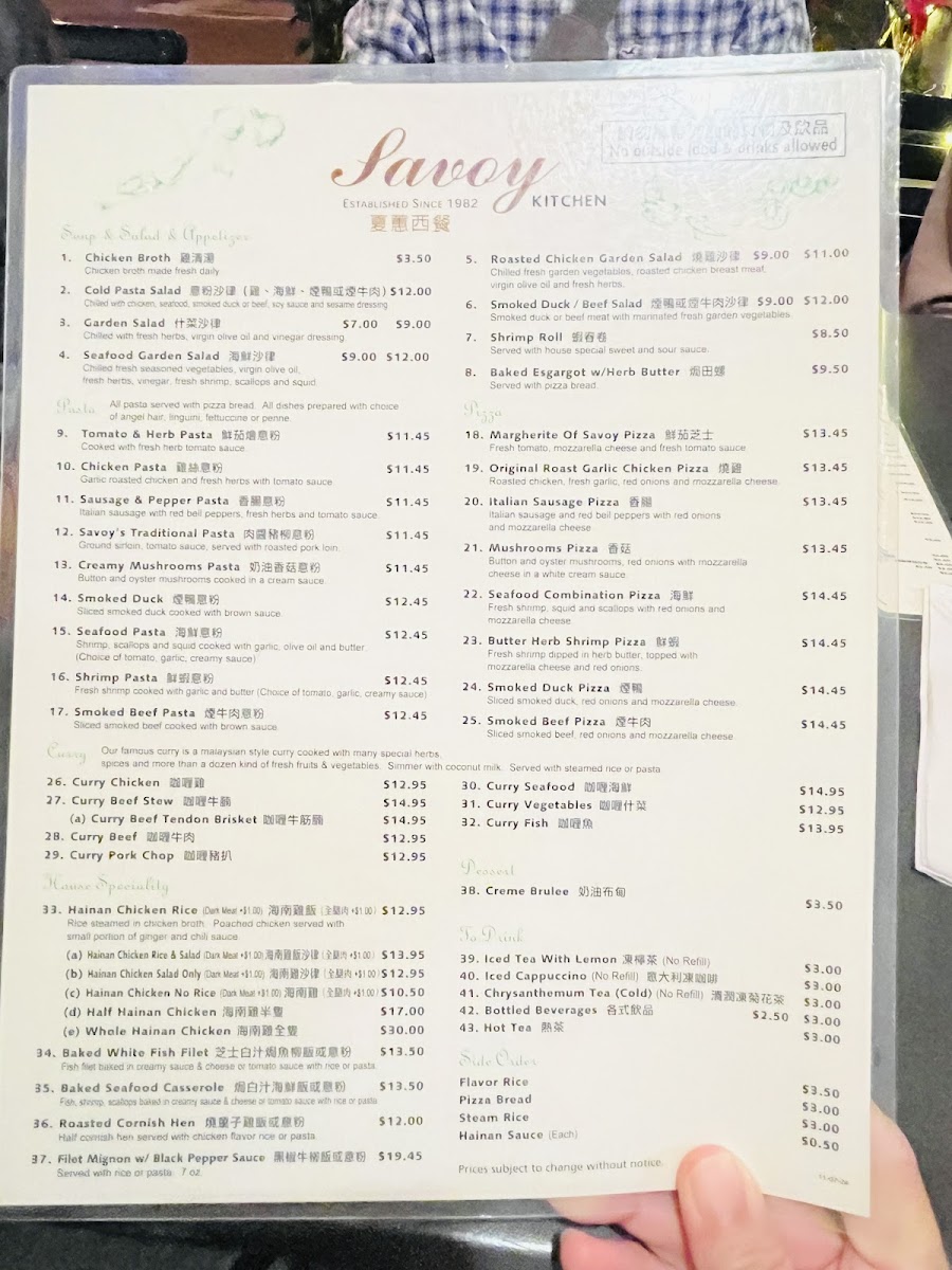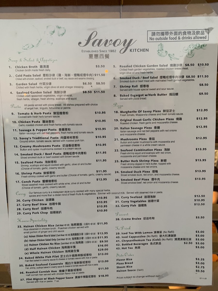 The menu at Savoy Kitchen offers a diverse selection that reflects its blend of Chinese, Southeast Asian, Vietnamese, and fusion cuisine. Visitors can expect a variety of dishes featuring signature items such as Hainanese chicken rice available with different meat options, seafood-based curries, and a range of other rice and noodle dishes. The menu also includes lighter fare like salads and unique fusion items including pizzas and escargot.